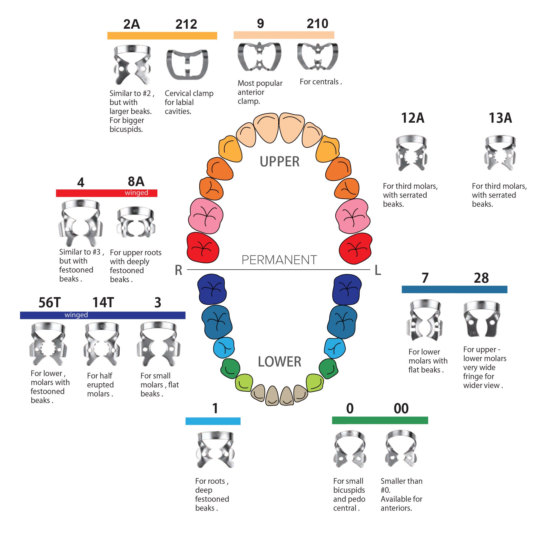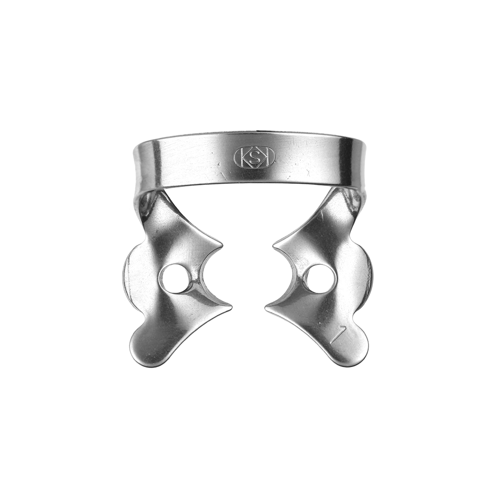 Los Clamps Dentech-KSK para dientes definitivos están diseñados para ofrecer un ajuste seguro, estable y duradero en tratamientos donde se utiliza goma dique. Son compatibles con distintas morfologías dentarias gracias a su amplia variedad de formas, permitiendo al profesional elegir el clamp ideal según el diente a tratar.