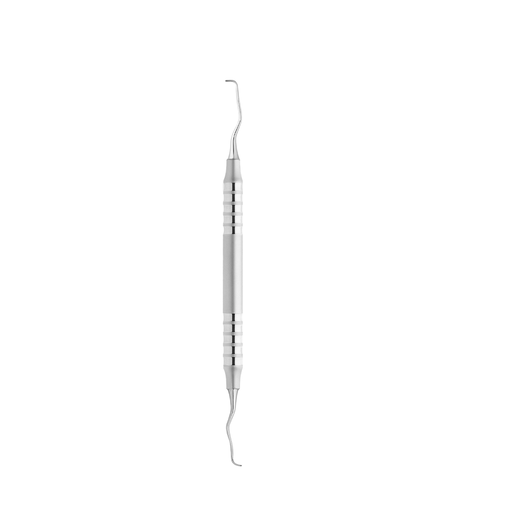 Origen Alemania. Cureta Gracey 11/12, uso en grupos posteriores-caras mesiales, sitio especifica: filo en un solo lado de parte activa, tallo standard.