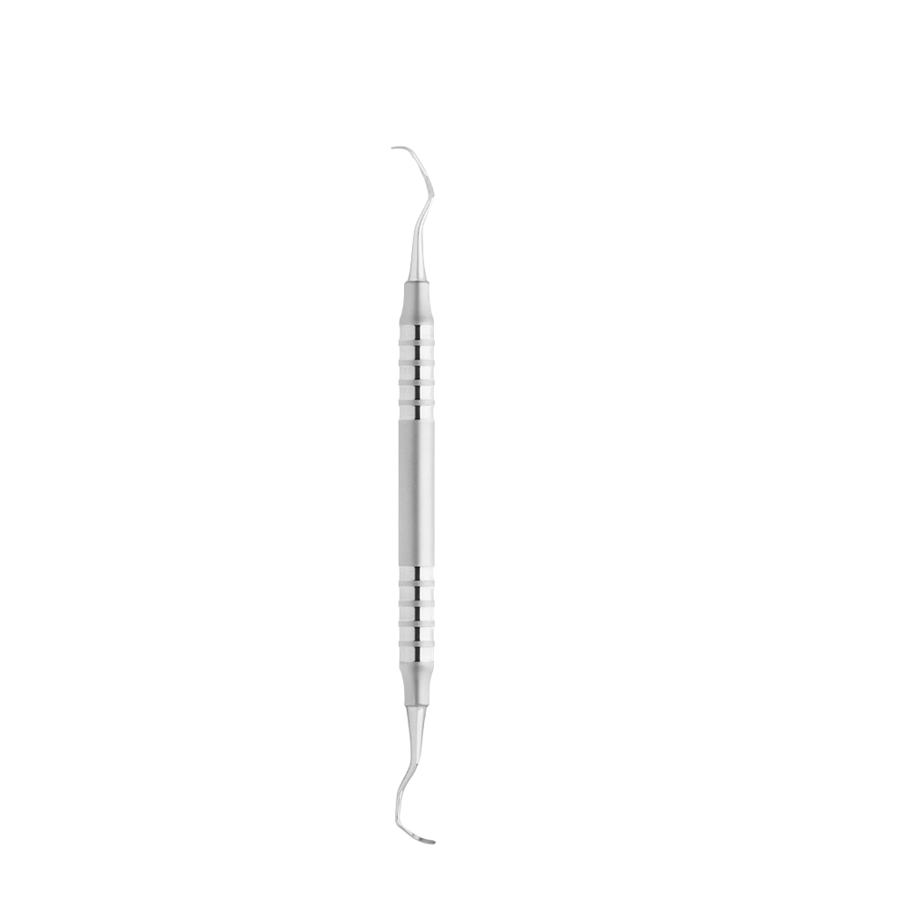Origen Alemania. Cureta Gracey 17/18, uso en grupos posteriores-caras distales cuando hay dificil acceso, sitio especifica: filo en un solo lado de parte activa, tallo standard.