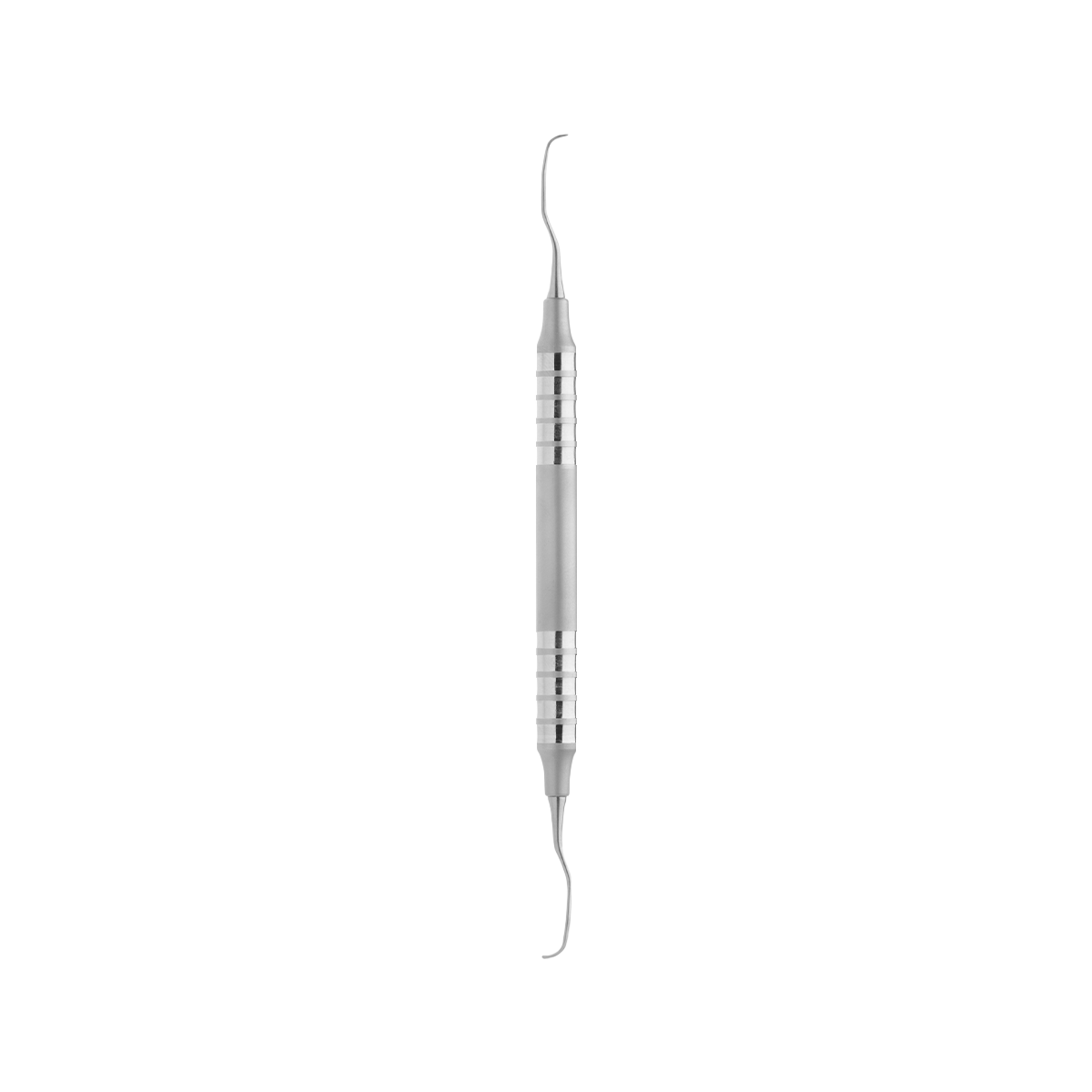 Origen Alemania. Cureta Langer 1/2, universal: filo en ambos lados de parte activa, pero de titanio para instrumentación de implantes y pilares de titanio.