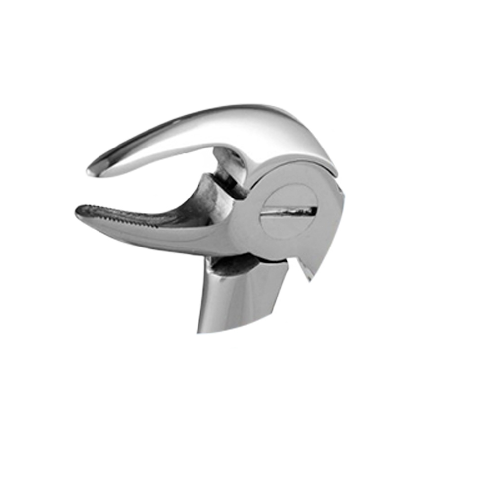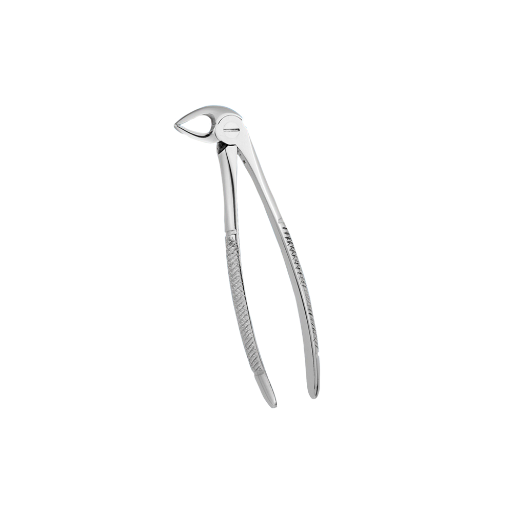 Fórceps pico de loro, curvo sobre el borde, fino. Bordes serrados para mejor tracción y sujeción al extraer.