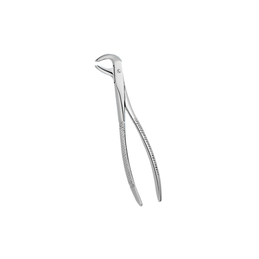 Fórceps pico de loro, curvo sobre el borde grueso, para molares inferiores. Cabeza pequeña, con biela, no tornillo. Ideal para cuando hay poca apertura.