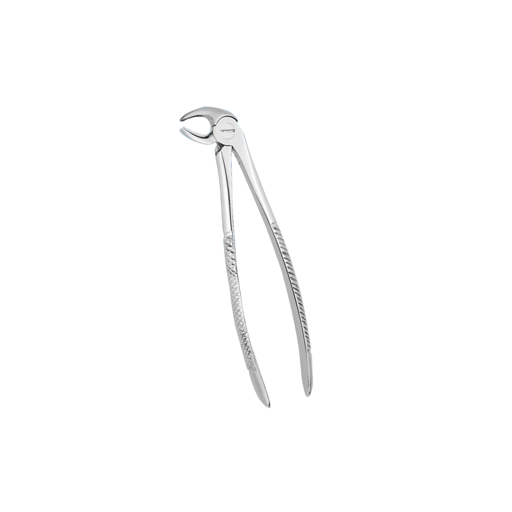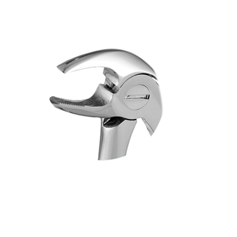 Fórceps pico de loro, curvo sobre el borde mediano, para premolares inferiores. Bordes serrados para mejor tracción y sujeción al extraer.